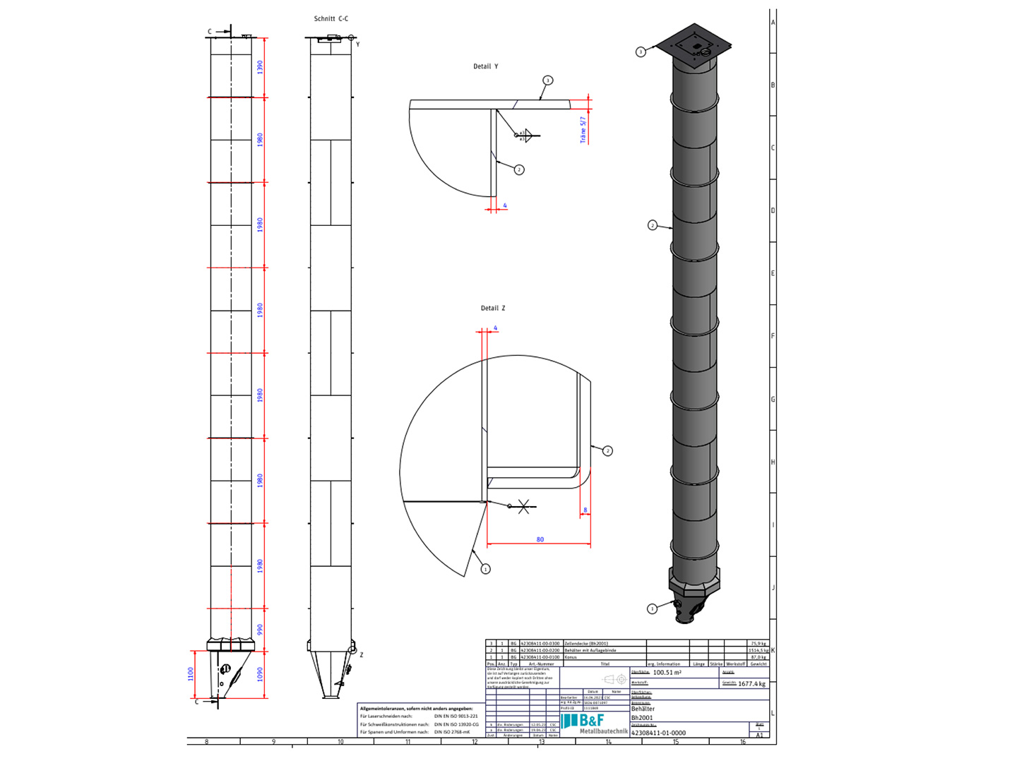 Diese rund 15 Meter langen Silobehälter wurden vollständig bei B&F Metallbautechnik konstruiert und in unserer Fertigung produziert – von der 3D-Planung bis zur finalen Umsetzung. Alle Arbeitsschritte wie Lasern, Kanten, Walzen, Schweißen sowie Lackierung erfolgen bei uns im Haus. Auch die Versandvorbereitung inklusive Planung für Sondertransporte wird von unserem Team umgesetzt.