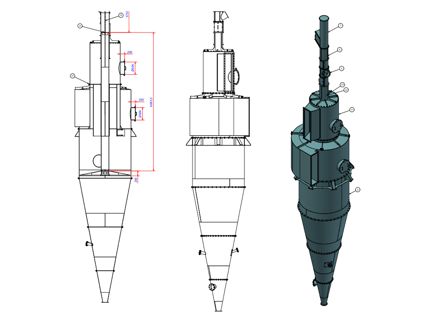 Dieser Zyklon wurde vollständig bei B&F Metallbautechnik konstruiert, in 3D geplant und direkt vor Ort gefertigt – vom Lasern über Kanten und Walzen bis zum Schweißen. Auch die Montage sowie der Test einer speziell entwickelten Hebevorrichtung erfolgten in unserem Betrieb.
